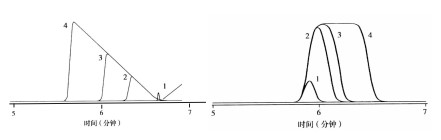 左圖:樣品質(zhì)量對峰寬和峰型的影響,峰1到峰4,進樣質(zhì)量逐漸增大。
