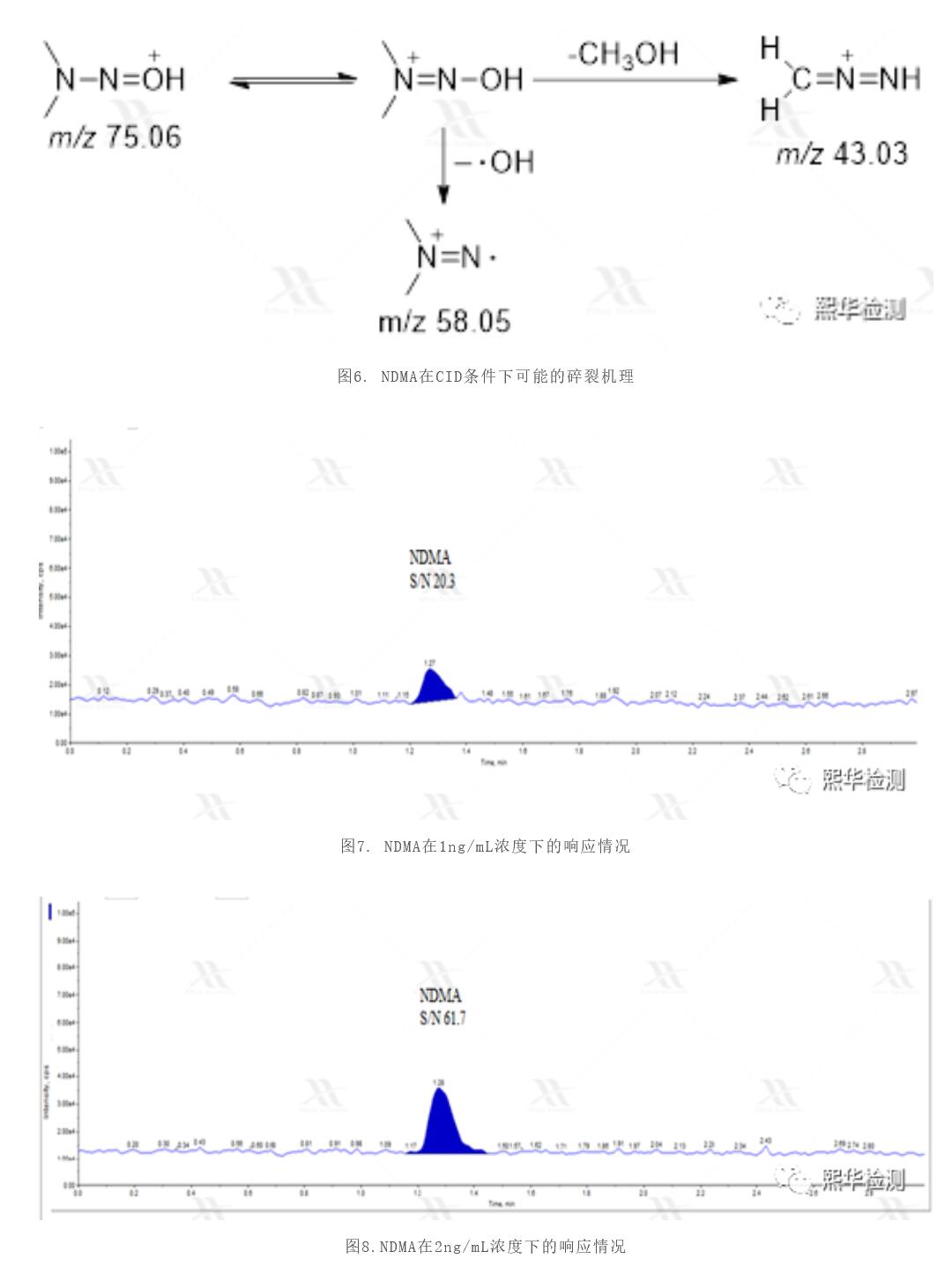為了考察三重四極桿質譜對NDMA的檢測能力,我們從幾臺API 6500plus液質系統(市面上靈敏度和穩定性最突出的三重四級桿質譜)中隨機選擇了一臺并開展了試驗(圖5)。通過條件摸索,可知NDMA質子加合物在常規CID(碰撞誘導解離)條件下,主要碎裂為m/z 43和m/z 58兩種碎片離子,推測其可能通過丟失甲醇分子以及羥基自由基【3】得到上述碎片(圖6)。鑒于該原理,我們使用m/z 43為定量離子,m/z 58作為定性離子。如圖7所示,使用FDA官方公布的液相條件,1ng/mL下NDMA對照品的信噪比為20.3,2ng/mL時為61.7,六針峰面積的RSD為2.5%。在有雷尼替丁及其制劑加標的情況下,回收率在90%以上,結果令人滿意。但另一方面,我們發現該方法的基線噪音異常地高。這也比較容易理解,因為NDMA質子化后,質荷比只有75,非常容易受到空氣、溶劑以及緩沖鹽體系中小分子雜質的干擾,導致噪音較大。