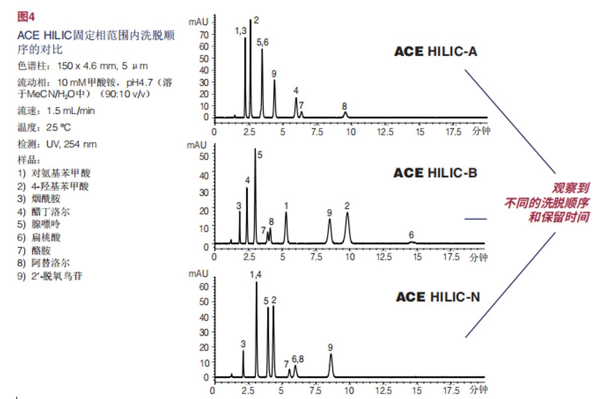 *堿性ACE HILIC-B相,能形成正電荷,對帶負電的酸性物質(zhì)產(chǎn)生靜電吸引,而帶正電的堿基(堿性物質(zhì)則)則被排斥。