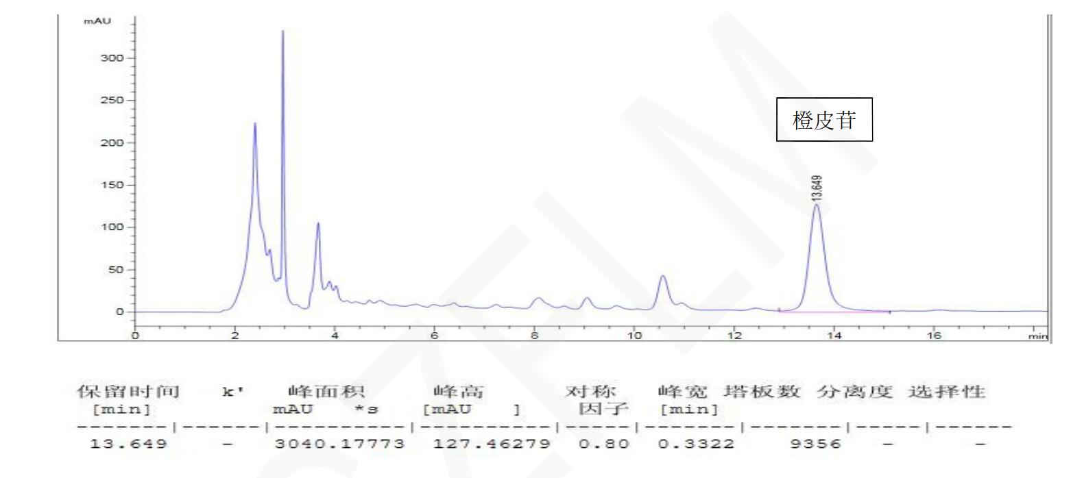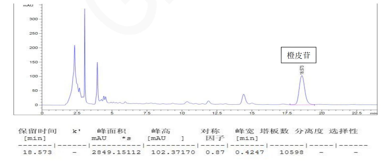 方法說明:使用 SuperLu C18 和 Superlu C18-AQ 兩款色譜柱進行嘗試,兩者均能滿足中國藥典要求,需注意的是,分析橙皮苷時采用的是 20%乙腈等度洗脫,會導致一些保留較強的雜質無法洗脫而殘留在柱子, 建議走完藥典規定的等度出峰后,最后升高有機相比例將其余雜質洗脫出,避免影響柱子壽命及重現性。