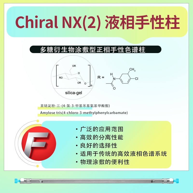 菲羅門Chiral NX(2)液相手性色譜柱采用直鏈淀粉-三-(4-氯-3-甲基苯基氨基甲酸酯)(Amylose tris(4-chloro-3-methylphenylcarbamate))作為固定相,這是一種多糖衍生物,能夠提供優異的手性識別能力。該色譜柱適用于正相液相色譜(NP-HPLC)以及超臨界流體色譜(SFC)分離模式,為手性化合物的分離提供了廣泛的選擇。