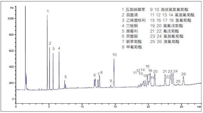 圖1 添加水平為0.2mg/kg大米中有機氯和擬除蟲菊酯類農藥多殘留檢測色譜圖