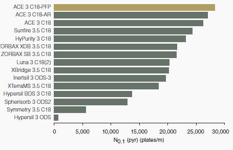 ACE C18-PFP由于其超惰性性質而達到了最高塔板數。