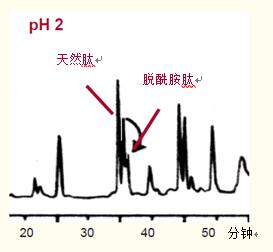 在pH為2的肽圖中,含有天冬氨酸的脫酰胺肽的疏水性比含天冬酰胺的天然肽略強,因此比天然肽略晚洗脫出來,如圖39所示。